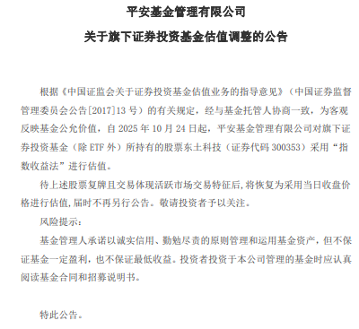 中国经济网北京10月27日电 近日,平安基金管理有限公司发布关于证券投资基金估值调整的公告。根据本公告,自2025年10月24日起,平安基金管理有限公司将采用“指数收益法”对旗下证券投资基金(不含ETF)持有的动土科技股票(股票代码300353)进行估值。上述股票复牌后,并以体现市场活跃特征的方式进行交易后,估值将重置为当日收盘价,届时不再发布新的公告。